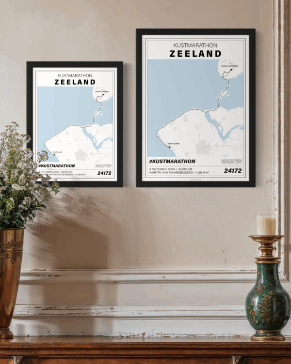 De posters worden met zorg vervaardigd met behulp van geavanceerde digitale printtechnieken op 220 gram High White papier, waardoor een uitstekende kwaliteit en lange levensduur worden gegarandeerd. Als optie kunnen ze worden geleverd met een elegante houten lijst met een kunststof raam, voor een stijlvol en gebruiksklaar geheel dat direct aan de muur kan worden gehangen. Dankzij de hoogwaardige print en materiaalkeuze bieden we een product dat niet alleen visueel indrukwekkend is, maar ook duurzaam en tijdloos, perfect om de bijzondere ervaring van de Kustmarathon Zeeland 2025 vast te leggen.