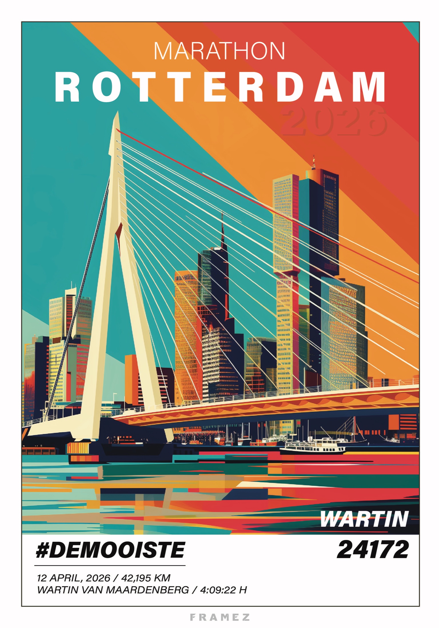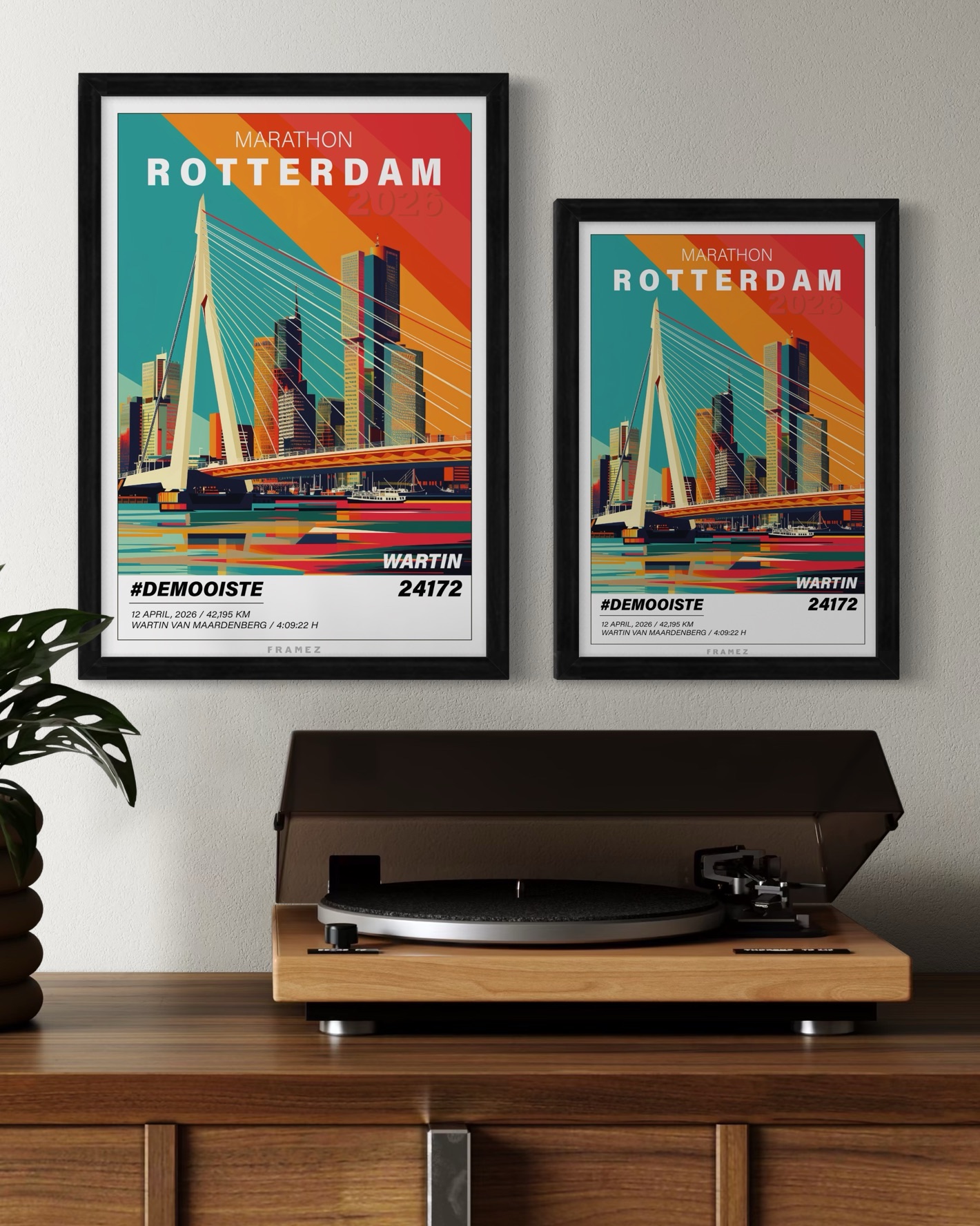 Onze posters worden vervaardigd met hoogwaardige digitale toners op 210 grams papier, wat een ongeëvenaarde kwaliteit en duurzaamheid garandeert. Optioneel kunnen ze worden geleverd met een houten lijst met kunststof raam, waardoor je een prachtige presentatie krijgt die direct klaar is om op te hangen. Met deze combinatie van premium printtechnologie en materiaalkeuze bieden we een product dat zowel esthetisch als langdurig van aard is, perfect voor het vastleggen van de pracht van de Marathon Rotterdam 2026.