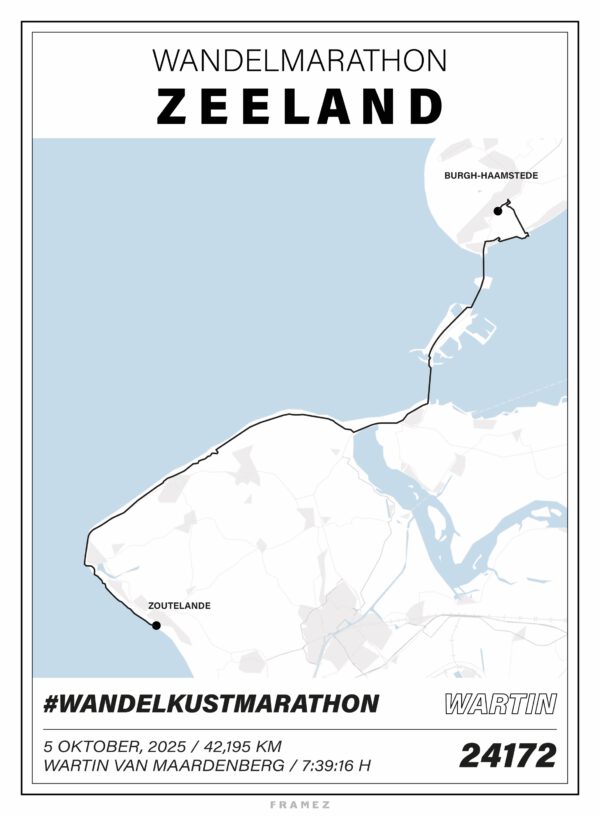 De kunstzinnige poster van de Wandelmarathon Zeeland 2025 belichaamt de unieke sfeer van dit uitdagende wandel evenement langs de Zeeuwse kust, met dynamische kleuren en vloeiende lijnen die de ruige natuur en de kracht van de deelnemers benadrukken. Dit hoogwaardige ontwerp is een must-have voor liefhebbers van de Kustmarathon en langeafstandslopers in het algemeen. De poster herinnert aan een van de zwaarste, maar ook mooiste wandelmarathons van Nederland, ideaal voor in huis, op kantoor of in een sportstudio. Deze editie is speciaal ontworpen voor de volledige marathonafstand van 42,195 kilometer.