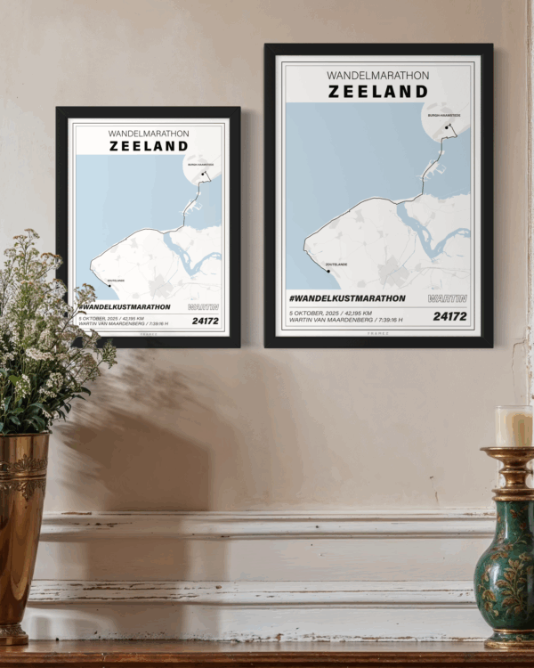 De posters worden met zorg vervaardigd met behulp van geavanceerde digitale printtechnieken op 220 gram High White papier, waardoor een uitstekende kwaliteit en lange levensduur worden gegarandeerd. Als optie kunnen ze worden geleverd met een elegante houten lijst met een kunststof raam, voor een stijlvol en gebruiksklaar geheel dat direct aan de muur kan worden gehangen. Dankzij de hoogwaardige print en materiaalkeuze bieden we een product dat niet alleen visueel indrukwekkend is, maar ook duurzaam en tijdloos, perfect om de bijzondere ervaring van de Wandelmarathon Zeeland 2025 vast te leggen.